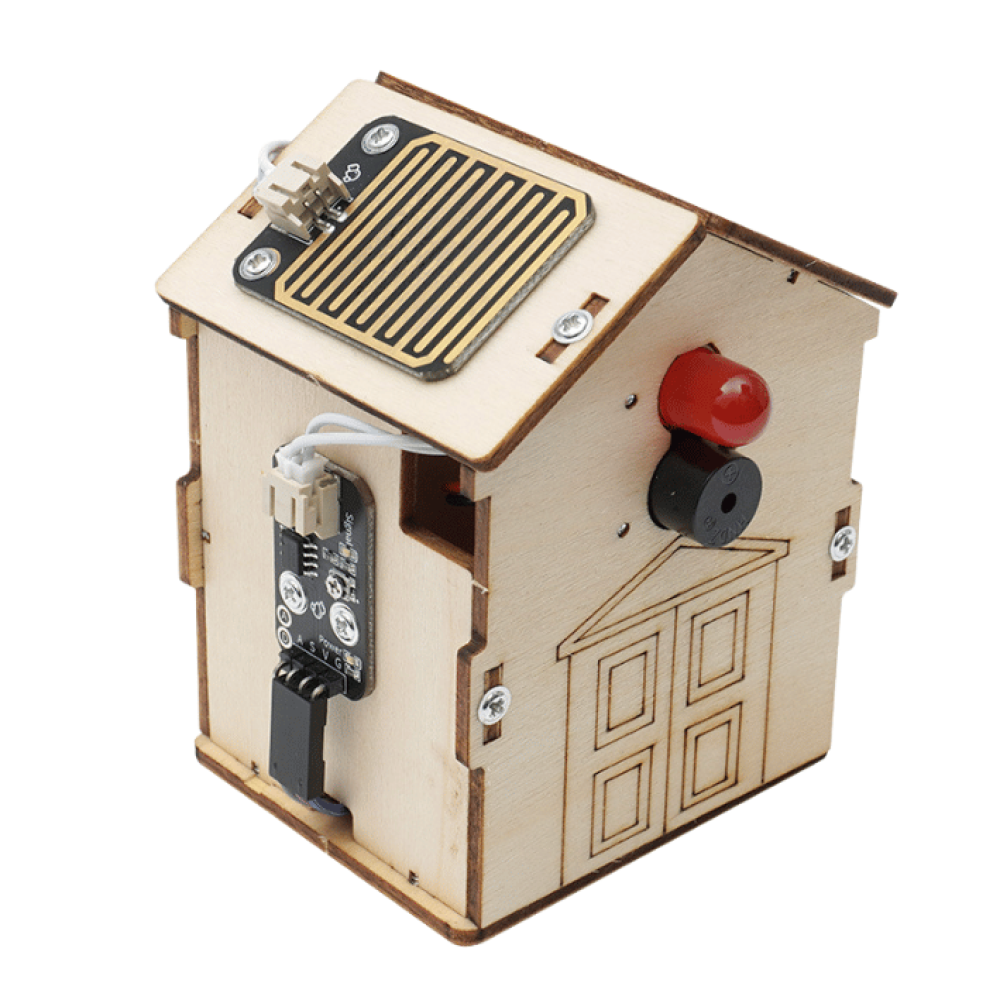 تجربة تعليمية ممتعة تتيح للأطفال استكشاف كيفية عمل مستشعرات الماء والدوائر الإلكترونية، حيث يتفاعل النموذج مع قطرات المطر ليضيء مصباح LED ويصدر جرس تنبيه عند اكتشاف الماء، مما يساعدهم على فهم تطبيقات المستشعرات الذكية.