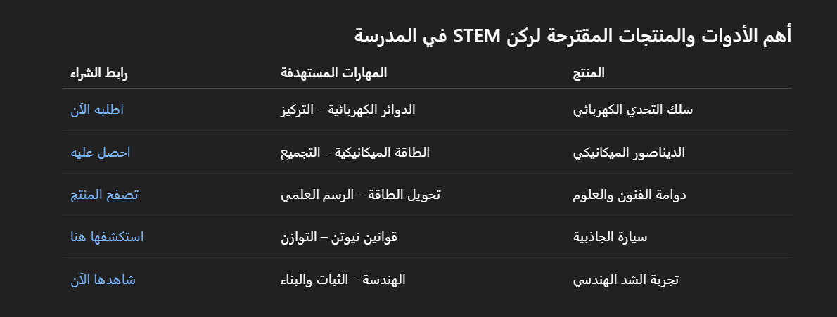 أهم الأدوات والمنتجات المقترحة لركن STEM في المدرسة